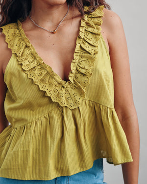 Chic with a touch of drama, this sleeveless top features a deep V neckline framed by playful ruffle detailing for an effortlessly flirty finish. Its breezy, flowy silhouette makes it the perfect piece to dress up for date night or keep cool and cute all day long.