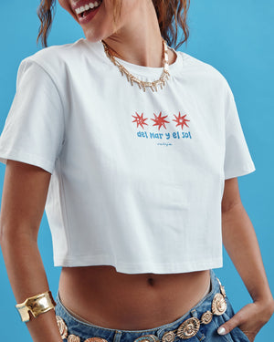A playful crop top that channels laid-back days under the sun. This fitted baby tee is made from a soft stretch fabric that hugs the body, featuring a cheerful front graphic with three suns and the words “del mar y el sol” — perfect for adding a pop of fun to your everyday look. Pair it with high-waisted shorts or flowy skirts for an effortless vibe.