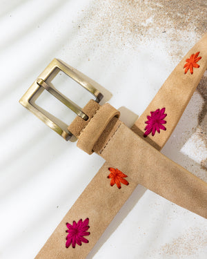 Add a pop of desert heat to your denim with this rustic suede belt, featuring hand-stitched florals in vibrant sunset shades. It’s the perfect blend of rugged charm and boho flair, ready to take your favorite outfit on a stylish adventure.