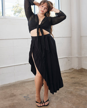Turn up the drama with this chic twist-front crop top, designed with a flirty plunge neckline and flowy bell sleeves that bring all the movement. Lightweight and effortlessly glam, it’s the perfect throw-on piece for sunset cocktails, beach nights, or anytime you’re feeling a little extra.