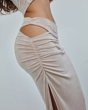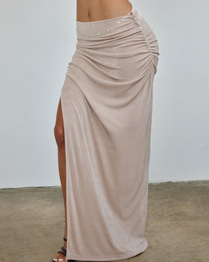 This fitted maxi skirt features a high waisted appeal and a hugging bodice. Coming in a variety of neutral colors, this maxi pairs well with any top.