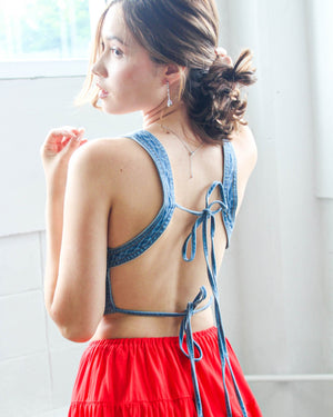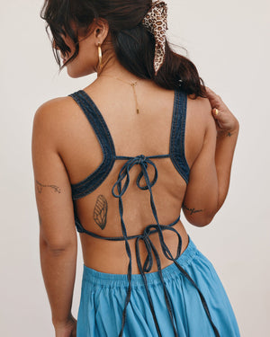 Your go-to crop, leveled up in denim.A bold yet minimal staple that pairs clean lines with an open-back twist. Designed with a flattering square neckline and thick straps, the front keeps things structured and sleek, while the back brings the drama with double adjustable tie closures for a customizable fit. It’s the kind of piece that’s made to go from day to night, casual to elevated, all with a single switch of accessories.