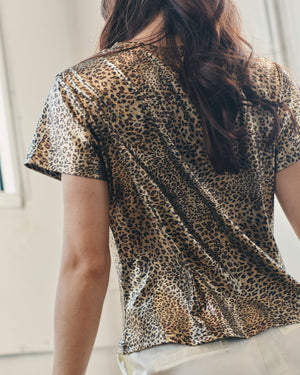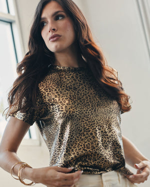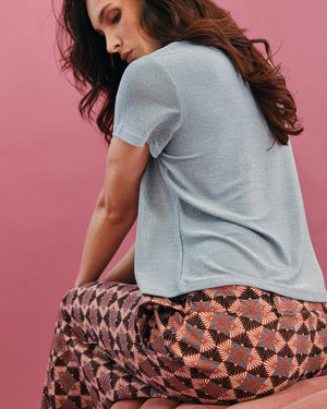 This shimmery T-shirt brings effortless glam to your everyday style with its soft drape and subtle sparkle. Easy to dress up or down, it’s the kind of piece that makes even a simple jeans-and-tee moment feel instantly elevated.