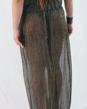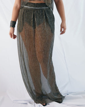This shimmery midi skirt brings instant party energy with its soft drape and light-catching finish. Dress it up, dress it down — either way, it does the sparkling for you.