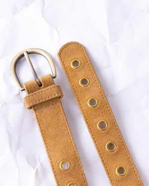 This leather belt brings a touch of rugged charm with its rich tan finish and sleek gold-tone stud detailing. Finished with a classic metal buckle, it’s the perfect way to cinch your look with a little edge and a lot of style.