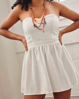 Turn on the charm in this strapless mini jumpsuit with a sweetheart neck, gathered waistband, and a smocked back that hugs you just right. Flirty, fun, and ready for anything, this dress is basically your new partner-in-crime for all things cute!