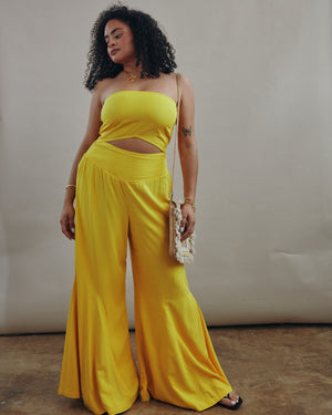 Slip into this sleek one-piece jumpsuit that pairs a strapless cut-out bodice with dramatic flared legs for instant, head-turning flair. It’s the effortless, dance-ready outfit that makes every move look like a moment.