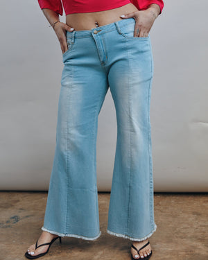 Step into effortless style with these high-waisted denim pants, featuring a trendy wide-leg silhouette and chic front seam detailing. Finished with a playful raw-fringe hem, these jeans are the perfect foundation for everything from a casual day out to a polished evening look.