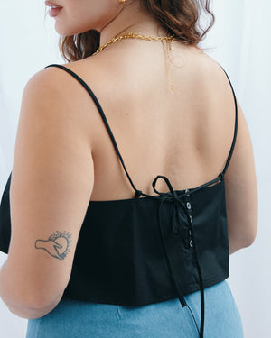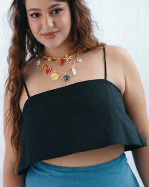This breezy crop top keeps things sweet and simple with slim spaghetti straps and a clean square neckline. The button-back detail adds just the right touch of charm — perfect for sunny days, iced coffees, and effortless outfits.