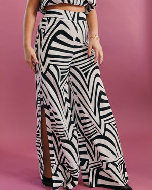 These high-rise pants bring instant drama with their bold print and leg-lengthening silhouette. Finished with a breezy side slit, they’re the perfect blend of statement style and effortless comfort.