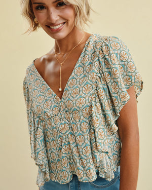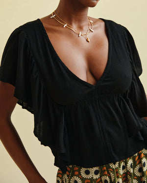 Float through your day in this breezy casual top, featuring a soft, airy silhouette with delicate ruffled sleeves and a flattering V-neckline. The charming open-back detail adds a playful, feminine touch that pairs perfectly with your favorite denim.