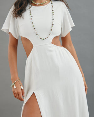 This statement maxi dress turns heads with its bold design, flirty cut-out waist, and dramatic thigh-high slit that brings instant movement and attitude. Equal parts playful and powerful, it’s made for golden-hour moments and nights that don’t end early.