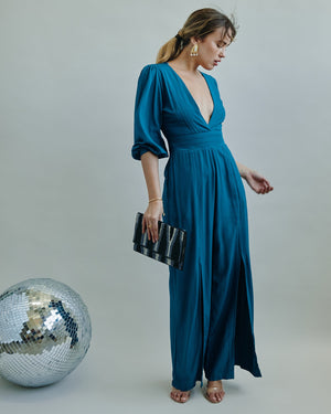 This deep cut v-neck maxi features a long, A-line skirt and beautiful long sleeves. Elegant, floor length and ready to impress- this bohemian inspired maxi has it all.