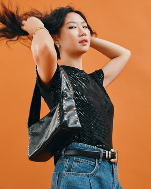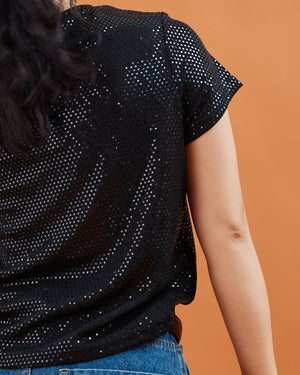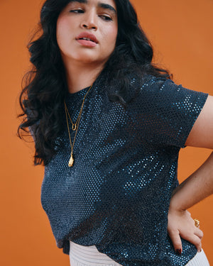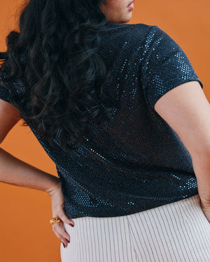 Shine brighter than your plans in this shimmery crew neck top with a relaxed, boxy fit. With short sleeves and a sparkle-packed fabric, it’s your go-to for effortless glam and all-night shimmer.