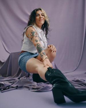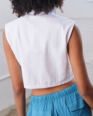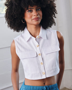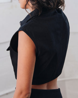 Utility meets style in this cool cropped vest top, featuring a sharp collar, bold button front, and statement flap pockets. Edgy yet versatile, it’s the perfect piece to layer or wear solo for an effortlessly confident look.