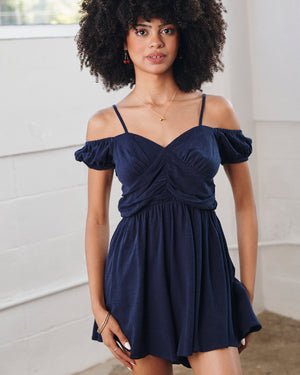 Sweet and flirty, this off-shoulder jumpsuit features soft ruched detailing, delicate straps, and charming puff sleeves for a romantic touch. The smocked back and flowy silhouette keep it comfy and carefree — perfect for sunny strolls and weekend plans.