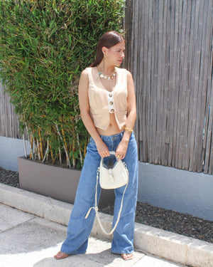 Add a touch of 90's fashion to your ensemble effortlessly with this adorable vest. Designed to stay open and accent any top, this neutral toned vest is the perfect summer staple.