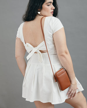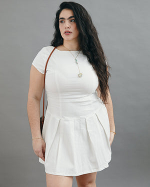 Steal the spotlight on date night in this mini empire dress, featuring a wide neckline and romantic puff sleeves. With a plunging tie-back, drop waist, and flared pleated skirt, it’s equal parts playful, flirty, and unforgettable.