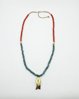 Bring on the beachy vibes with this pendant necklace, where colorful ceramic disc beads in a trio of shades dance together in vibrant harmony. Finished with a beautifully detailed brass fish pendant, it’s your perfect catch for sun-soaked days and carefree style!