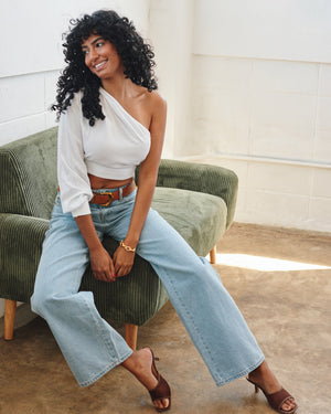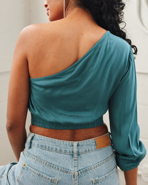 This soft and versatile off the shoulder design features one long sleeve. With a cinched waist, this simple top is perfect for any occasion.