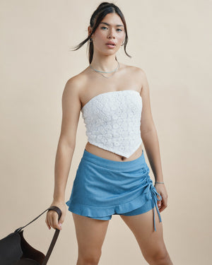 This mini denim skort is your new style crush, combining the easygoing vibe of denim with a frilled hem and a flirty coquette bow accent. With its mid-rise waist and easy fit, it's the ideal choice for stepping out in effortless charm!